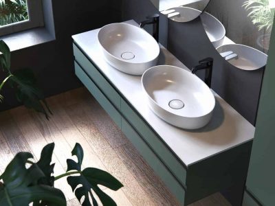 2022-es újdonság, divatos színekben, széles méretválasztékban. Kerrock fedlappal és mosdómedencékkel rendelkező, fürdőszoba bútor. Rejtett bemart fogantyúkkal tervezték, fiókrendezője széria tartozék, mosdó medencéje két féle formában választható. Újdonság továbbá a dupla kerek tükör, egy szenzoros kapcsolóval.
