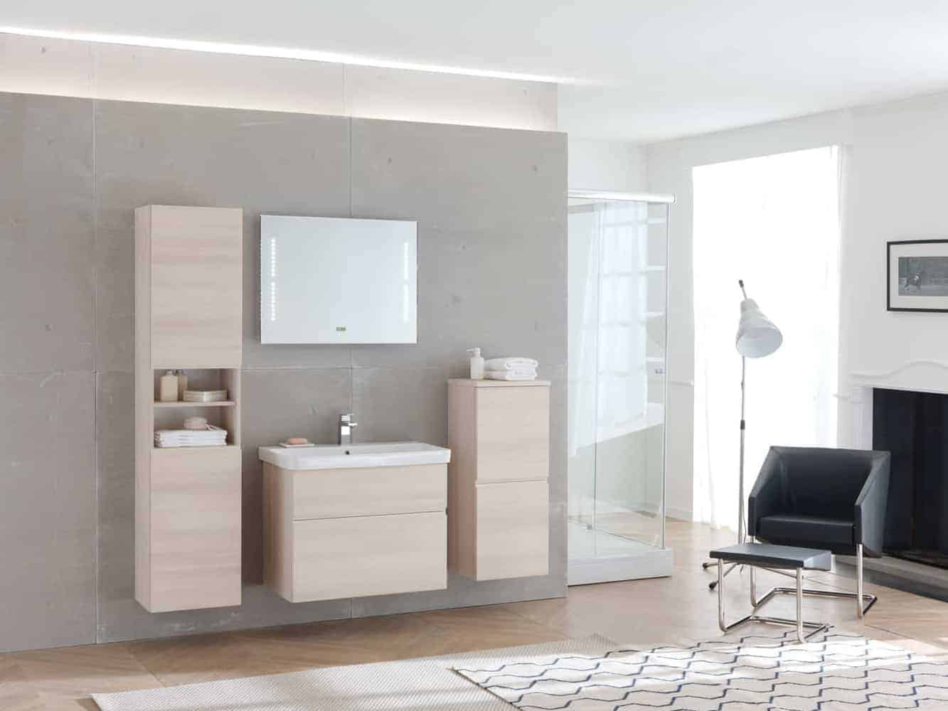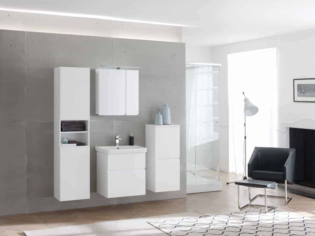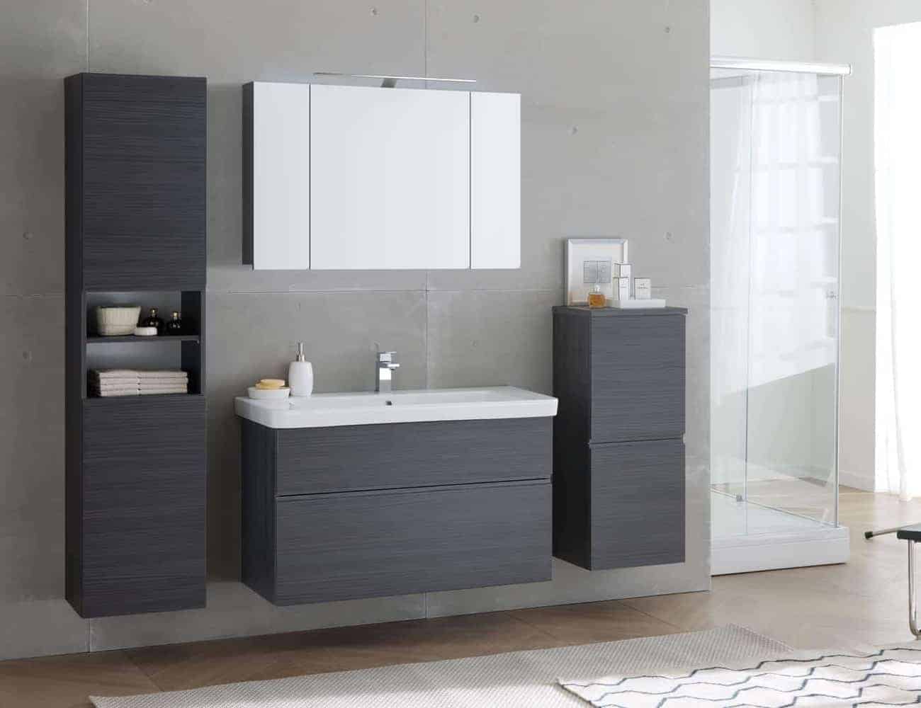 Az ajtós szekrény modern, egyenes vonalvezetése harmonikusan illeszkedik a többi elemhez, egységes és letisztult összképet teremtve a fürdőszobában.