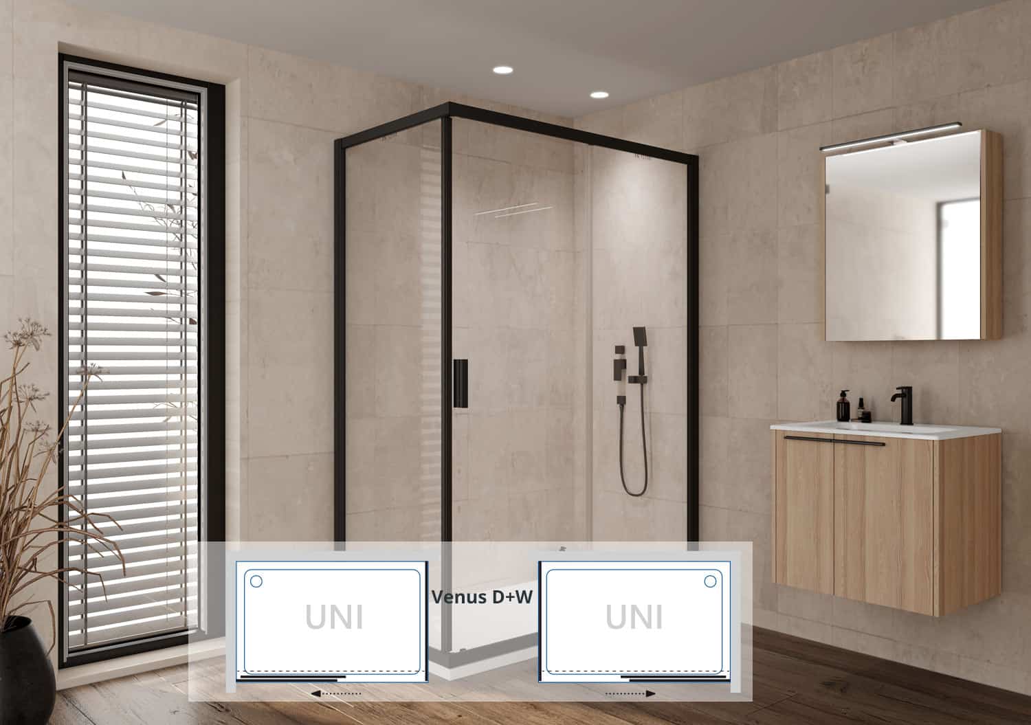 A Venus sorozatú D+W 1 db Venus D zuhanyajtóból és egy 1 db Venus W oldalfalból áll össze. A két zuhanyajtó lehetséges méretvariációit lejjebb görgetve találja meg.
